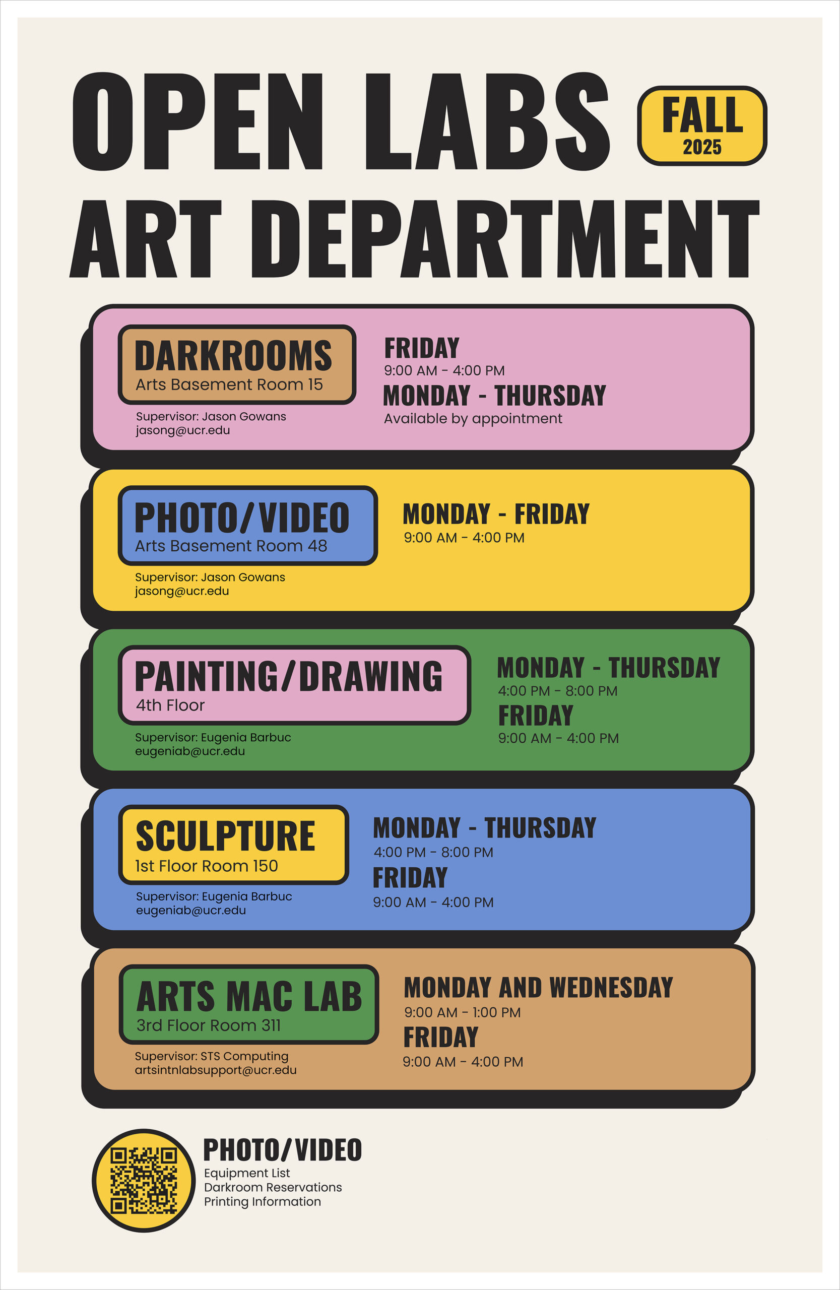 Art classes can check out or return equipment in person in the John Divola Lounge (Arts 048).